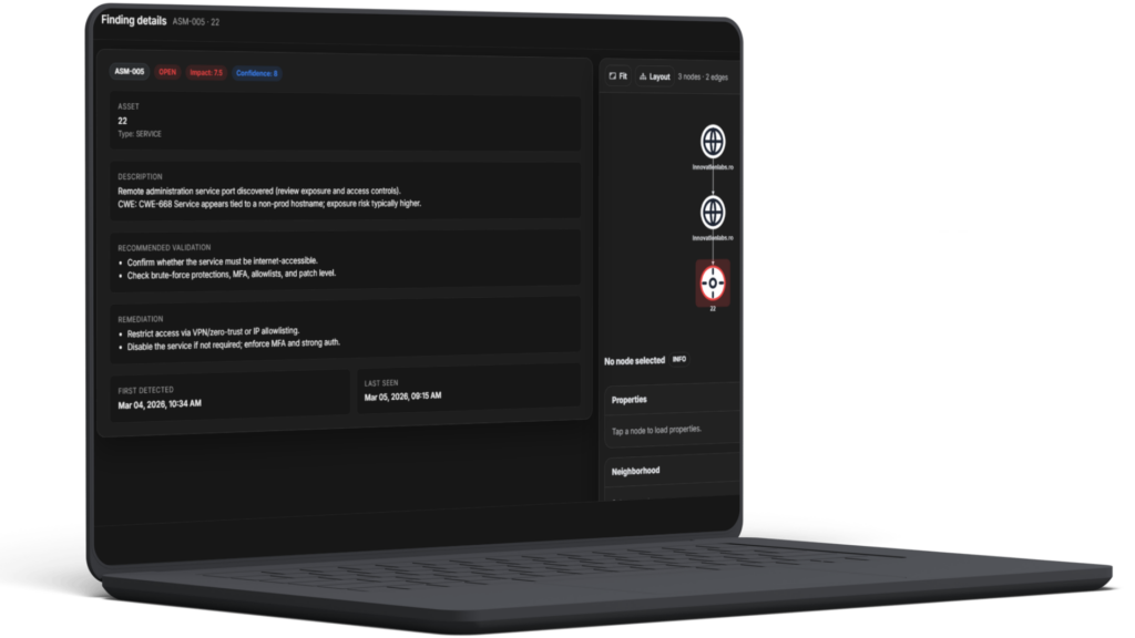 Evidence-backed findings and scoring aligned to exposure, exploitability, and ownership signals.