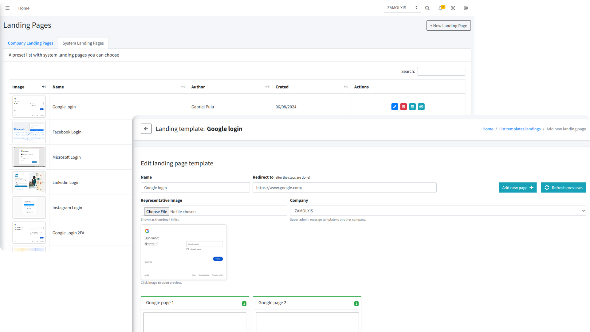 Deploy prebuilt landing pages or create custom experiences with the built-in HTML editor. Support multi-step phishing flows with separate stages, custom triggers, and configurable data capture fields to match realistic attack narratives.